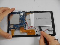 Use the spudger tool to break the adhesive holding the battery down and lift it off of the base of the tablet. One of the blue iFixit opening tools can also be used in place of the spudger.