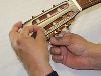 With your right hand, keep the string tense so that the knot at the bridge does not come undone.