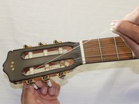Remove the old string from the bridge by undoing the knot and pulling it out from the bridge hole.