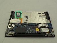 Find the SSD located on a corner of the side directly opposite where the laptop screen and device body are connected.