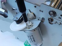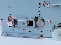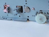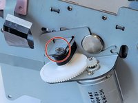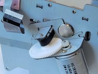 Under the motor there is a white plastic gear. To remove it, gently pull it off the axle.