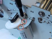 Use a Phillips #1 screwdriver to remove the two 7 mm screws from the belt holder under the main motor.