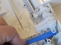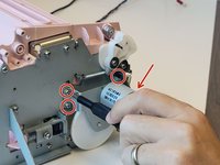 Use a Phillips #1 screwdriver to remove two 10 mm screws. These are parallel to one another, one on either side of the machine.