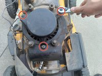 Using a wrench, remove the three nuts from the lawnmower’s defective recoil starter.