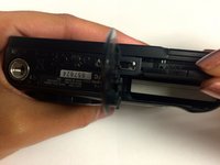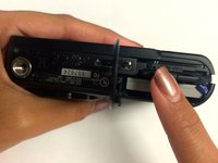 Place your thumb on the arrow and while placing some pressure, slide to the right and lift. The battery compartment will be exposed.