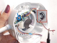 The speaker is circular, black and silver in color with a red and black cord. It is easily removed from the upper body of the camera with your fingers or safety tweezers.