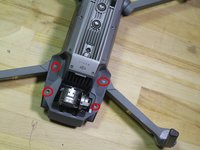 Remove the four closest screws circled in red. The ones closest to the front are 5.8mm long, with a 2mm diameter, while the ones closer to the rear of the drone are 4.8mm long, with a 1.5mm diameter. Be careful not to confuse these screws when reassembling the drone.