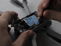 Flip the drone over so that it is right-side up. Then, use a soldering kit to remove the black, red, and white cables from the motherboard.