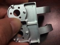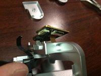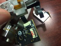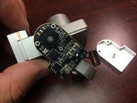 As you lift the parts be very gentle as there is a ribbon cable attaching the camera to the main circuit board. The metal plates lift out of the way and the gimbal is now in two pieces.