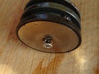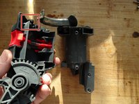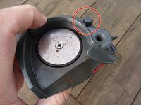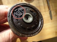 Achte auf den winzigen schwarzen Gummipuffer mit fünfkantigem Profil. Es handelt sich um den Anschlag für die Tresterschaufel. Er fällt oft heraus. Setze ihn beim Zusammenbau wieder zwischen die beiden Gehäusehälften ein.