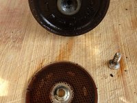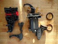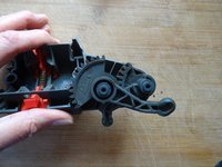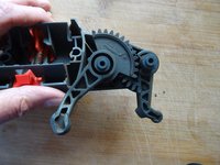 Merke dir die Position der beiden Hebel mit der Verzahnung im unteren Bereich und die Stellung des Kolbens für den späteren Zusammenbau. Ziehe sie dann ab.