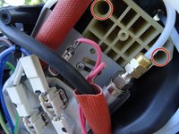 Ziehe in der Mitte die Klammer heraus und löse die Druckleitung. Achte auf die O-Ring-Dichtung. Sie bleibt entweder an der Leitung oder im Anschluss hängen. Ersetze sie beim Zusammenbau wenn möglich durch eine neue.