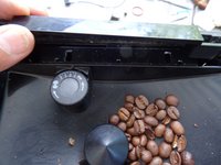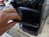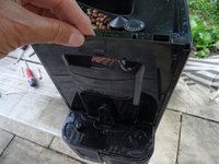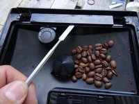 Die Klappe des Bohnenfachs muss abgenommen werden. Sie ist links und rechts eingerastet, die Raste wird von einer Feder unter Spannung gehalten. Drücke die Feder zusammen, bis die Raste frei ist und hebe die Klappe ab.