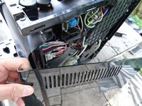 Das rechte Seitenteil wird genauso entfernt, allerdings behindert die Serviceklappe ein wenig. Öffne sie zunächst und schiebe das Seitenteil ein paar Millimeter nach hinten. Das geht oft schwer und du benötigst ein Hebelwerkzeug aus Kunststoff.