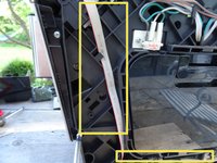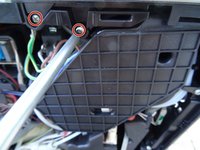 Unter der Klappe befindet sich eine Abdeckleiste aus Kunststoff. Sie ist nur eingerastet. Löse sie mit einem flachen Werkzeug ab und hebe sie heraus.