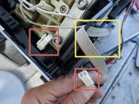 Hebe das Bedienpanel ein wenig hoch. Drücke die Verriegelung am weißen Stecker und ziehe den Stecker ab.