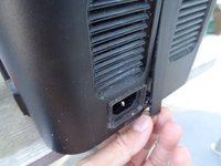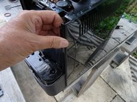 Die seitlichen Abdeckungen sind noch mit zwei Schrauben auf der Rückseite befestigt. Diese befinden sich unter einer Abdeckleiste, die nur eingerastet ist. Nimm die Abdeckleiste ab und lege sie zur Seite.