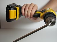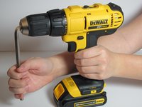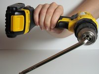 With your nondominant hand lay the drill flat on the edge of a table such that chuck hangs off the edge. Hold the head of the drill tightly pushing it against the table (not the part with the battery).