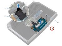 Using the pull tab, pivot the solid-state drive bracket and peel off the bracket from the tabs on the computer base.