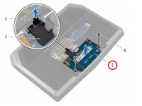 Using the pull tab, pivot the solid-state drive bracket and peel off the bracket from the tabs on the computer base.