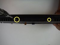 Remove (2) 5 mm Phillips head screws attaching the small access panel to the base using a Phillips # 1 screwdriver.