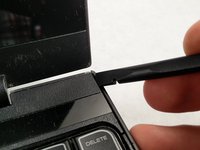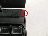 Now, flip the computer back over. Above the "DELETE" key on the edge of the computer is a small indent. Here you will use the spudger to pry this plastic piece up.