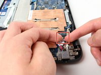 Locate and gently pull the wire harness (small plastic box with wires leading to the black audio speakers) directly out of the connector on the motherboard.