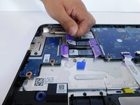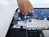 Remove the clear adhesive tape on the system board from the battery cable from where it's seated above the battery.
