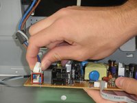 There is a wire connecting the motherboard to the inverter board. Squeeze both sides of the connector and pull to remove it from the socket.