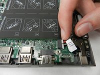 Flip the motherboard over and, using a soldering iron, apply heat to the 7 solder points of the audio jack. Carefully pull the audio jack out from below.