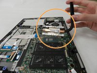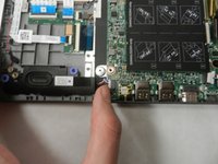 Using the Phillips #0, unscrew two 3mm screws holding the fan in place and disconnect the cable connecting it to the motherboard. There is an adhesive tab holding the hard drive cable in place up against the fan; remove this as well.