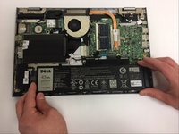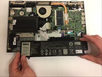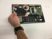 The battery will be the largest black component in the device located near the bottom edge. Using a Phillips #0 screwdriver, unscrew the two 3mm Phillips head screws holding in the battery.