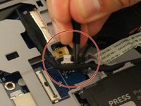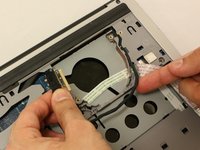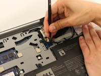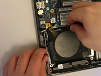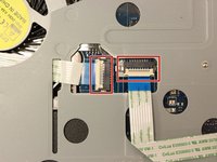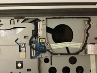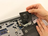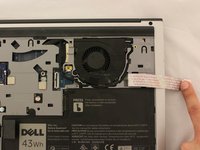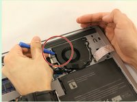 Remove the thick white cable crossing over the fan, using the blue spudger shown, to flip the securing flap holding down the cable.