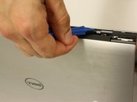 Using the blue spudger pry the gray plastic plating off. Be mindful of the openings along the top side between the hinges.