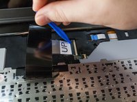 Carefully disconnect the ribbon cable by flipping up the tab holding the cable in place by using a plastic opening tool. Set keyboard and ribbon cable aside.