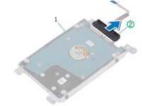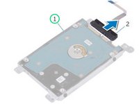 Lift the latch and using the pull tab, disconnect the hard-drive cable from the system board.