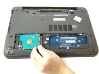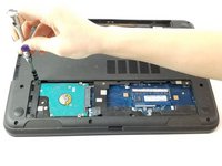 Lift the access panel away from the laptop to reveal the hard drive on the left.