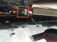 Remove the fan cable, indicated by the red marker in the picture, by pulling it out from the connector. Be careful to pull it out by the plastic end instead of by the cable.