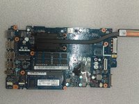 The motherboard can then be removed. This involves puling it to the right to disconnect the ports on the left, downward to get it out from under the hinge, and then up.