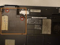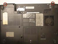 Remove the two 10 mm Phillips #1 screws from the bottom of the laptop that attach the lid assembly to the laptop with a Phillips #1 screwdriver.