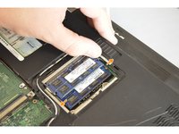 Remove the RAM by gently pulling back the small clips along the side of the RAM, and lifting the RAM upwards so the RAM is now angled.