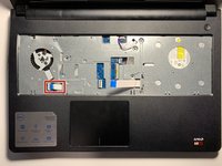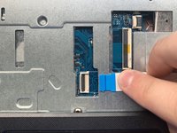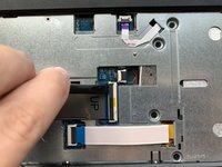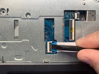 Using the hooked end of the Halberd Spudger, pull the black tab to the left to expose the touchpad cable.