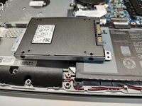Now you have access to the inside of the laptop. My device was without an HDD, you can see that its place is empty. You have to remove the metal casing for the HDD, which is held by these screws. There are four screws provided with which you can fixthe HDD to its place (in my case a 2,5 inch SSD) on the metal frame.