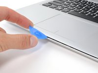 Insert an opening pick between the front edge of the back cover and the chassis, near the trackpad.
