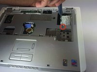 Gently pull the blue tab to separate the screen connection from the laptop.