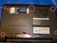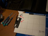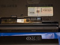 Turn over laptop .Remove battery from laptop by pushing the two tabs are highlighted in blue. Place the battery off to the side.
