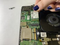 Using a Phillips #00 screwdriver, remove the 3 mm screw that secures the wireless-card bracket and wireless card to the I/O board.