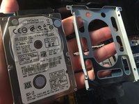 With the hard drive and the metal case that encloses the hard drive removed from the laptop, you will see two screws on either side of the metal case. Remove these screws and lift the hard drive out of the metal casing.