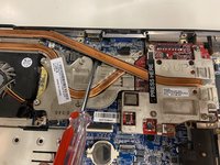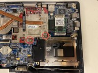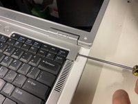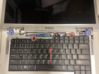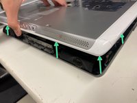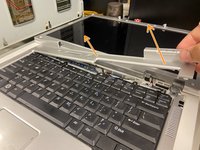 Remove the last two screws holding the display in. Rotate the display to an upright 90-degree position. Gently pull up to remove the display.