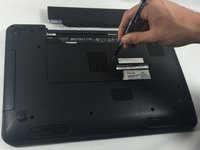 Slide both of the battery release latches on the bottom of the device in towards the center of the computer.